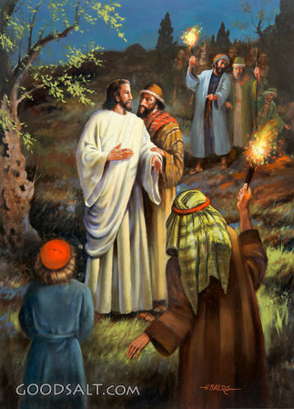 The Betrayal Luke 22:47-48 kiss, betrayal, judas, gethsemane, night, easter, passion, soldiers, harry baerg, bsnt230betrayal001chb_r, bsnt230betrayal001chb, bb-12545, judas betrays christ PROJECTION - License for PowerPoint™ PRINT – buy a print of this picture; optional frame Bible Hub |