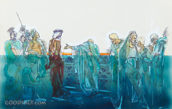 Behold the Man Luke 23:13-25 Mark 15:6-15 John 18:38-40 John 19:4-6 christ, Jesus, audience, blue, sketch, presenting, pilate, sacrifice, easter, passion, Washes PROJECTION - License for PowerPoint™ PRINT – buy a print of this picture; optional frame Bible Hub |