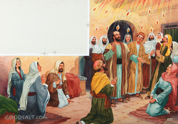 Tongues of Fire Acts 2:2-4 pentecost, disciples, acts, holy spirit, herbert rudeen, tongues of fire, one accord, flames of fire, bsnt301pentecost002chr, review & herald PROJECTION - License for PowerPoint™ PRINT – buy a print of this picture; optional frame Bible Hub |