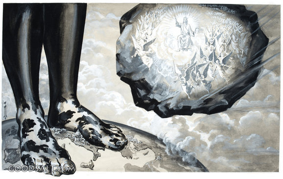 Jesus, stone, world, clay, feet, iron, kingdom, prophecy, angels, grayscale