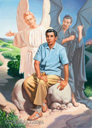 The Choice Psalm 25:12 Deuteronomy 30:15-19 narrow, angel, choice, bad, rock, decision, hispanic, ethnic, man, lucifer, life, path, destruction, road, wide, good PROJECTION - License for PowerPoint™ PRINT – buy a print of this picture; optional frame Bible Hub |