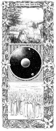 sun, creation, creator, moon, flowers, angels, stars, vintage, lilies border