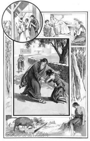 party, father, feed, prodigal, return, welcome, son, wild, living, swine, pig
