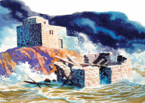 down, built, parable, flat, rock, fell, sand, house, storm, firm, Stood