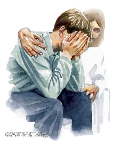 Jesus Comforting a Troubled Man. 2 Corinthians 1:3-5 sadness, help, Jesus, companion, pray, prayer, teenager, boy, man, sad, praying, male, frustrated, frustration PROJECTION - License for PowerPoint™ PRINT – buy a print of this picture; optional frame Bible Hub |