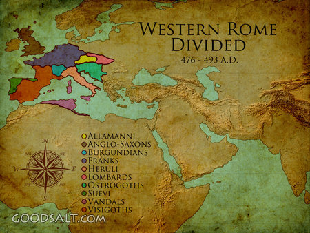 Map of Western Rome Divided Daniel 2:41-43 Daniel 7:7-8 divided, rome, map, ten, daniel, prophecy, division, toes, allamani, alamanni, anglo-saxons, anglosaxons, burgundi, franks, lombards, ostrogoths, suevi, vandals, visigoths, prophecyart PROJECTION - License for PowerPoint™ PRINT – buy a print of this picture; optional frame Bible Hub |