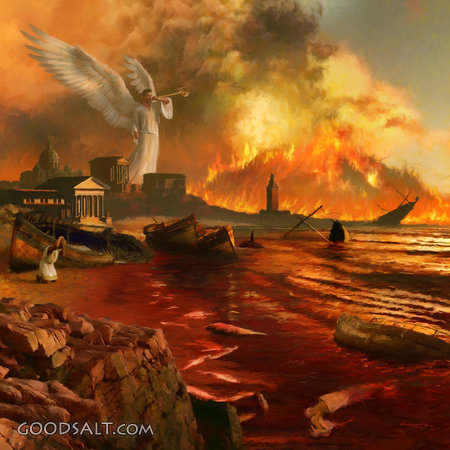 angel, dead, blow, trumpet, mountain, sea, second, blood, boat, ship, prophecy, fire, fish