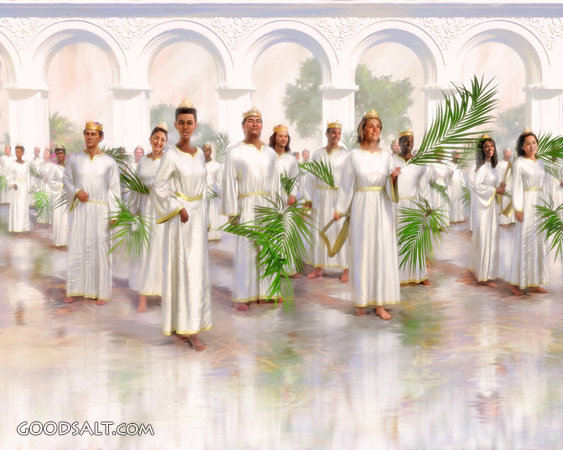Saints on the Sea of Glass Revelation 12:11 Revelation 15:2-3 Revelation 19:1-7 black, ethnic, crown, heaven, asian, saint, palm, gold, harp, branch, new jerusalem, sea of glass PROJECTION - License for PowerPoint™ PRINT – buy a print of this picture; optional frame Bible Hub |