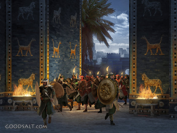 The Medes and Persians Invade Babylon Daniel 5:30-31 Isaiah 45:1 Isaiah 41:25 Isaiah 41:2 Jeremiah 51:49 Jeremiah 51 Jeremiah 27:7 darius, mede, babylon, night, Cyrus, Invasion, invade PROJECTION - License for PowerPoint™ PRINT – buy a print of this picture; optional frame Bible Hub |