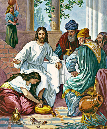Mary Anoints Jesus' Feet Matthew 26:6-13 Mark 14:3-9 John 12:1-8 Jesus, history, feet, mary, hair, prophecy, sin, anoint, discipleship, lazarus, ointment, perfume, martha, love, Bethany PROJECTION - License for PowerPoint™ PRINT – buy a print of this picture; optional frame Bible Hub |