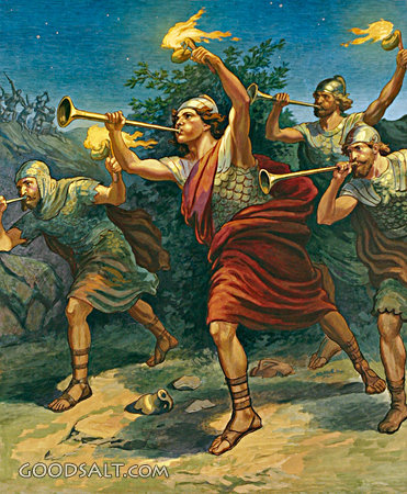 salvation, history, 300, prophecy, shout, gideon, midianites, army, judge, jars, torches, trumpets, pitchers