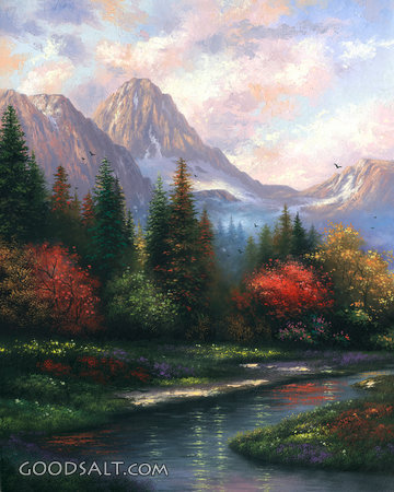 flowing, sky, nature, bird, spring, springtime, mountain, snow, cloud, river, tree, bush, creek, forest
