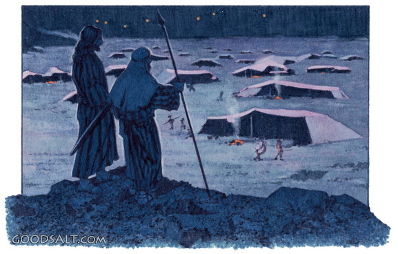 tent, israelite, looking, men, spear, watching, night, fire, village, spies, gideon, midianites, camp