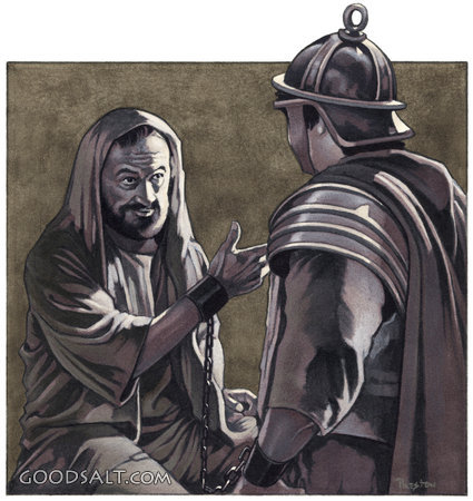 Paul and Centurion Acts 28:16 people, talk, talking, explaining, shackle, chain, man, men, apostle, disciple, person, centurion, soldier, paul, jail, prison, male, prisoner, guard, dungeon, armor PROJECTION - License for PowerPoint™ PRINT – buy a print of this picture; optional frame Bible Hub |