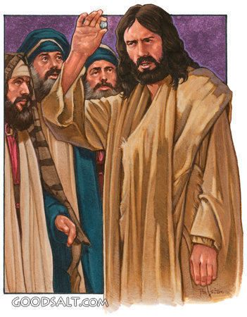 Matthew 22:17-21 Matthew 22:17-21 Mark 12:14-17 Luke 20:21-25 christ, Jesus, talk, talking, teach, teaching, parable, story, rock, man, men, teacher, pharisee, sadducee, follower PROJECTION - License for PowerPoint™ PRINT – buy a print of this picture; optional frame Bible Hub |