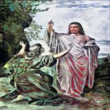 and she saw two angels in white sitting where the body of Jesus had lain, one at the head and the other at the feet.