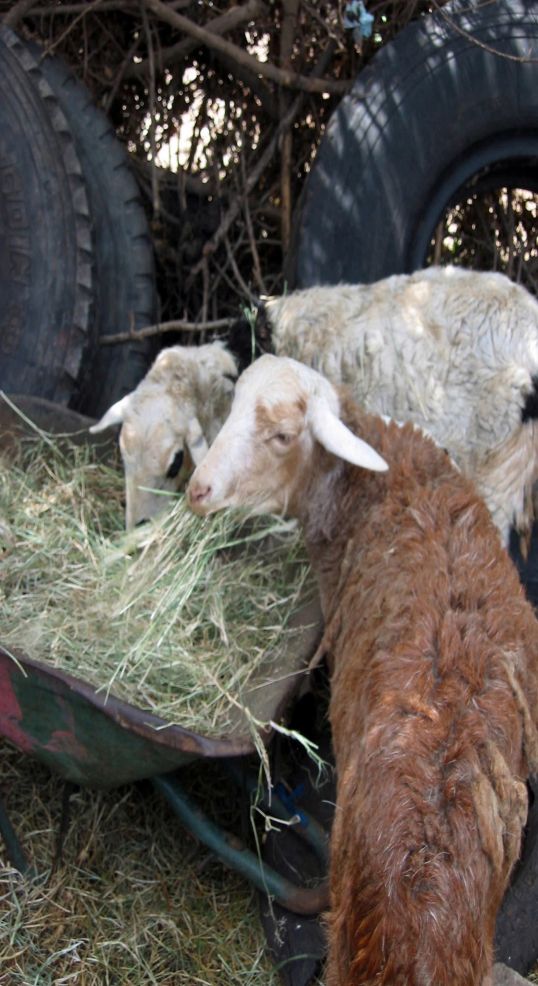 goat; wheelbarrow; tire; critter; creature; beast; brute; animal; mammal; outside; grass; grassland; plain; outdoors; wildlife; wheelbarrel; eating; hay; goats; wheelbarrows; tires; creatures; beasts; brutes; animals; mammals; outsides; grasses; grasslands; plains; hays
