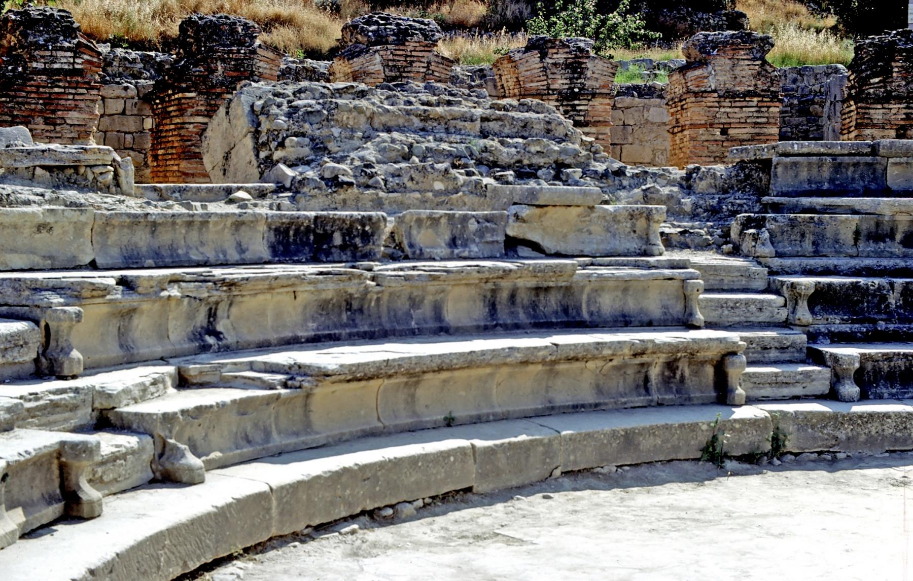 Sometimes known as Candia, Bible-time Crete is a large island in the Mediterranean Sea, about 150 miles long and 50 miles wide. The ship carrying Paul to Rome passed along the southern coast of Crete, where it encountered a storm (Acts 27:7-11). People of Crete were among those at Pentecost (Acts 2:11). Between Paul's first and second imprisonments, he and Titus visited Crete (Titus 1:5). Tradition says that Titus was bishop of Crete and that he died there in his old age. In one ancient writing, Titus is called Bishop of Gortyna. Paul's letter to Titus talks about the conditions on Crete. The Odeum at Gortyn, rebuilt by Trajan about 100 A. D.