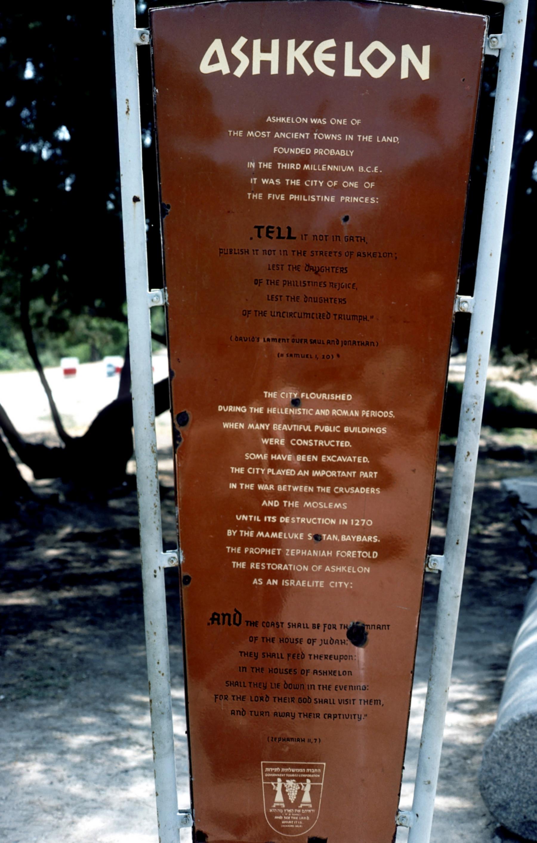 Sign. Sign. Before the conquest of the Promised Land, Ashkelon (Askelon or Ascalon) was a Canaanite city. The tribe of Judah conquered Ashkelon shortly after the death of Joshua (Judges 1:18), but then lost it to the Philistines. It became one of the five key Philistine cities. The other four were Gaza, Gath, Ashdod, and Ekron. It is mentioned in Samson's time as a Philistine city (Judges 14:19). David mentions Ashkelon when he lamented Saul's death (2 Samuel 1:20). Two prophets foretold its destruction (Zephaniah 2:4 and Zechariah 9:5). Ashkelon was the birthplace of Herod the Great and the residence of his sister Salome. Excavations at Ashkelon have revealed many period of history. Sign for Ashkelon. israel; ashkelon; askelon; ascalon; canaanite; philistines; judges 1:18; judges 14:19; 2 samuel 1:20; zephaniah 2:4; zechariah 9:5; archaeology; artifacts; antiquity; ruin; remains; sign; ruins; signs |