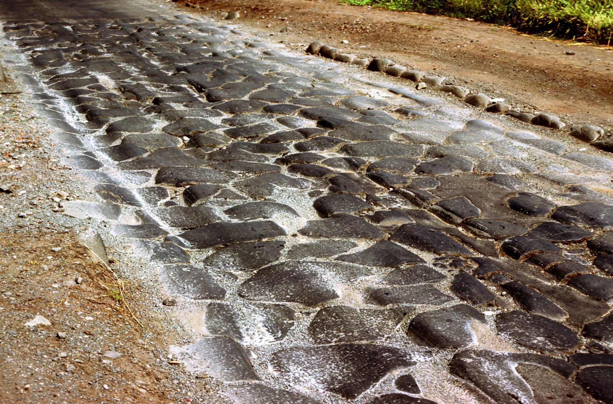 Appian Way Appian Way, paving stones. Roman roads were built so well that some are still in use today. They built their roads in this manner: from bottom to top they contained rubble, flat slabs in mortar, concrete and gravel, and tightly laid flat paving stones. Each road had its own curb (Curb stones) and a drainage ditch. appian; way; road; highway; transportation; roman; rome; italy; commerce; culture; antiquity; archaeology; paving; stone; ruin; ways; roads; highways; transportations; romans; cultures; pavings; stones; ruins |