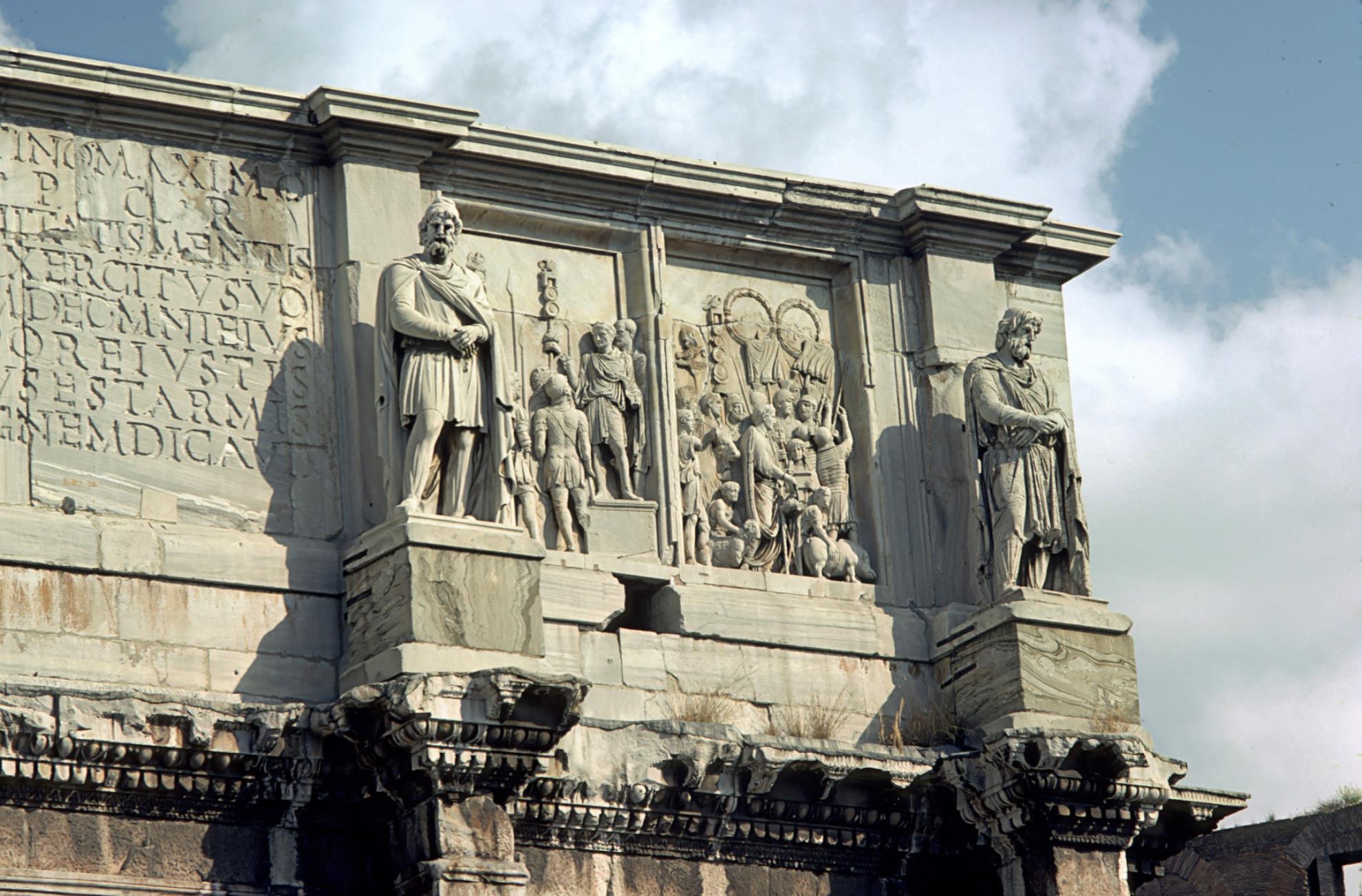 The Arch of Constantine The Arch of Constantine, Rome. A triumphal arch, erected about 315 AD to commemorate the triumph of Constantine I after his victory over Maxentius in the battle at the Milvian Bridge in 312 AD. The arch is located in the valley of the Colosseum, between the Palatine Hill and the Colosseum, along the road taken by the triumphal processions. The arch is the largest of only three such arches to survive in Rome today. The two others are the Arch of Titus and the Arch of Septimius Severus, both in the nearby Forum Romanum. arch; constantine; rome; italy; roman; ancient; culture; ruin; archaeology; old; time; antiquity; warfare; military; history; conquest; victory; defeat; battle; triumph; triumphant; celebration; ruin; people; arches; romans; ancients; cultures; ruins; times; militaries; histories; conquests; victories; defeats; battles; triumphs; celebrations; peoples |
