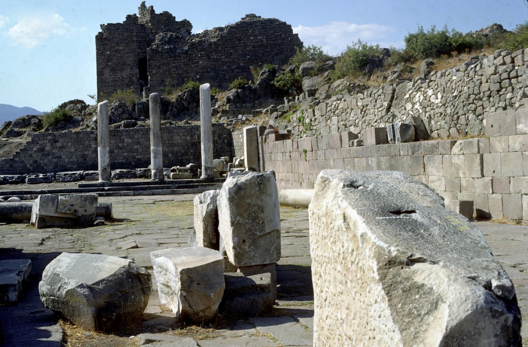 Ruins at Upper Pergamum, or Pergamos, Turkey. Pergamum was the site of one of the Seven Churches to whom Revelation was addressed (Revelation 3:12-17). Archaeological sites can be found at Upper and Lower Pergamum.