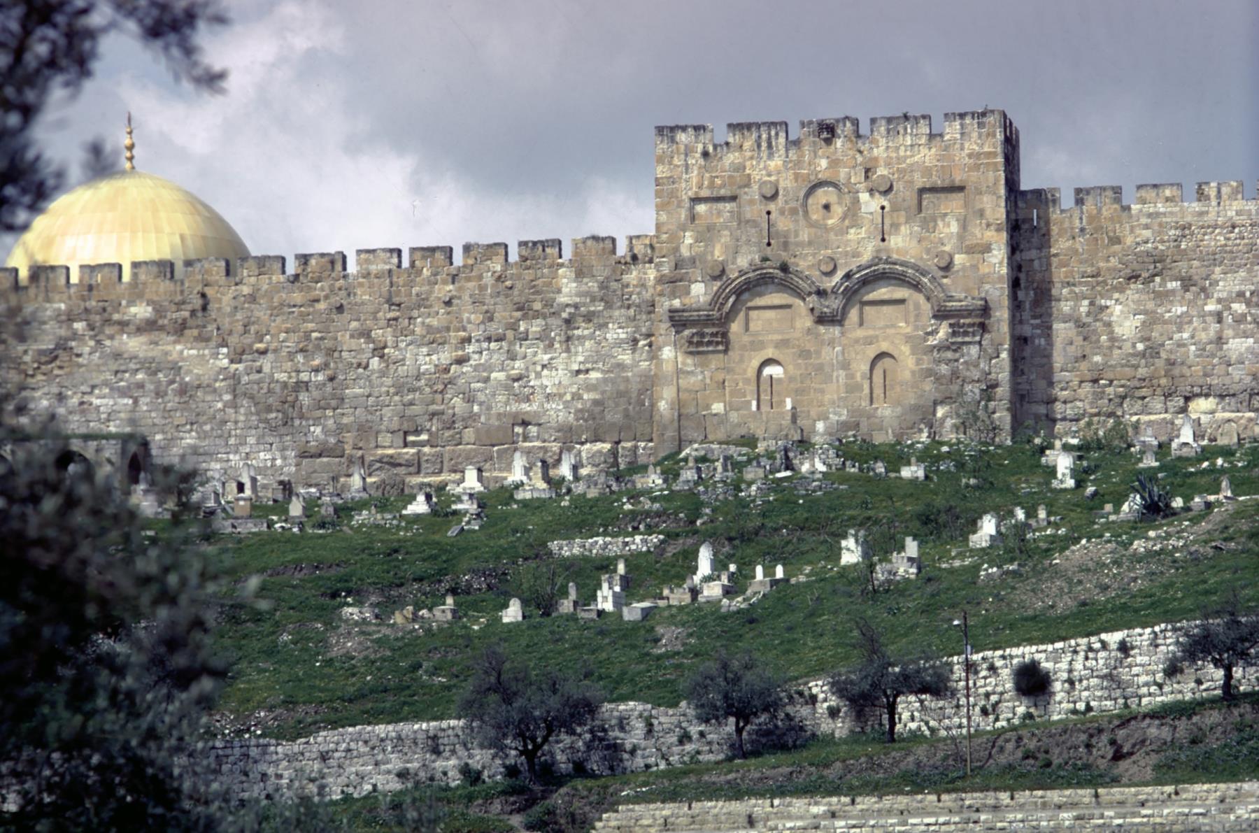 The Golden Gate The Golden Gate, in the eastern wall of the city, was the gate through which Jesus rode in his triumphal entry into Jerusalem. Muslims blocked it 1, 500 years later, thinking they were preventing the Messiah from going through it. golden; gate; jerusalem; eastern; wall; jesus'; triumphal; entry; gates; walls; entries |