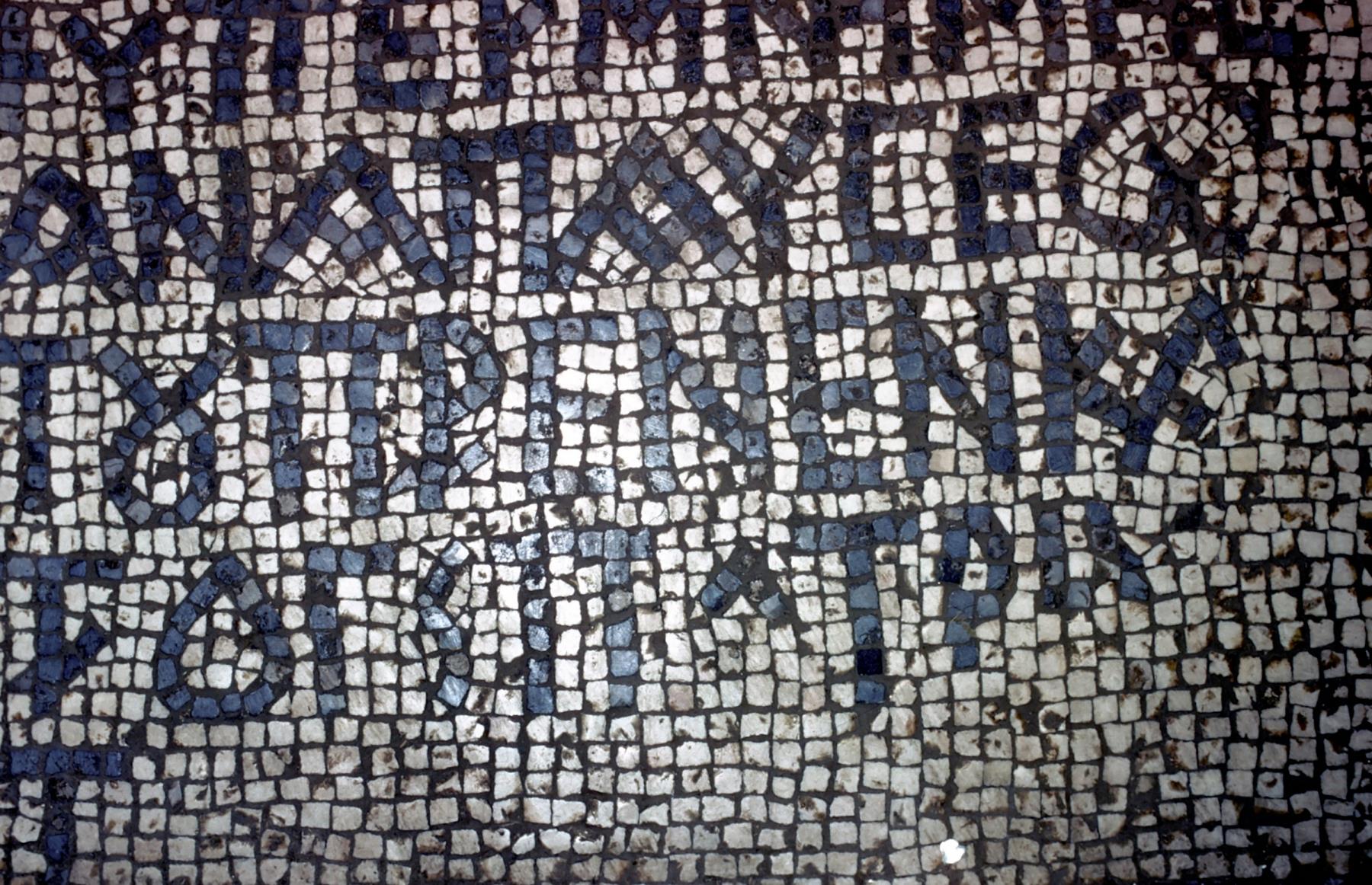 Mosaic inscription in Greek Mosaic inscription in Greek, discovered at the church that once marked Tabgha as the traditional site where Jesus fed the 5, 000. mosaic; inscription; writing; greek; church; tabgha; traditional; site; jesus; fed; food; feeding; 5; 000; mosaics; inscriptions; writings; greeks; churches; sites; foods |