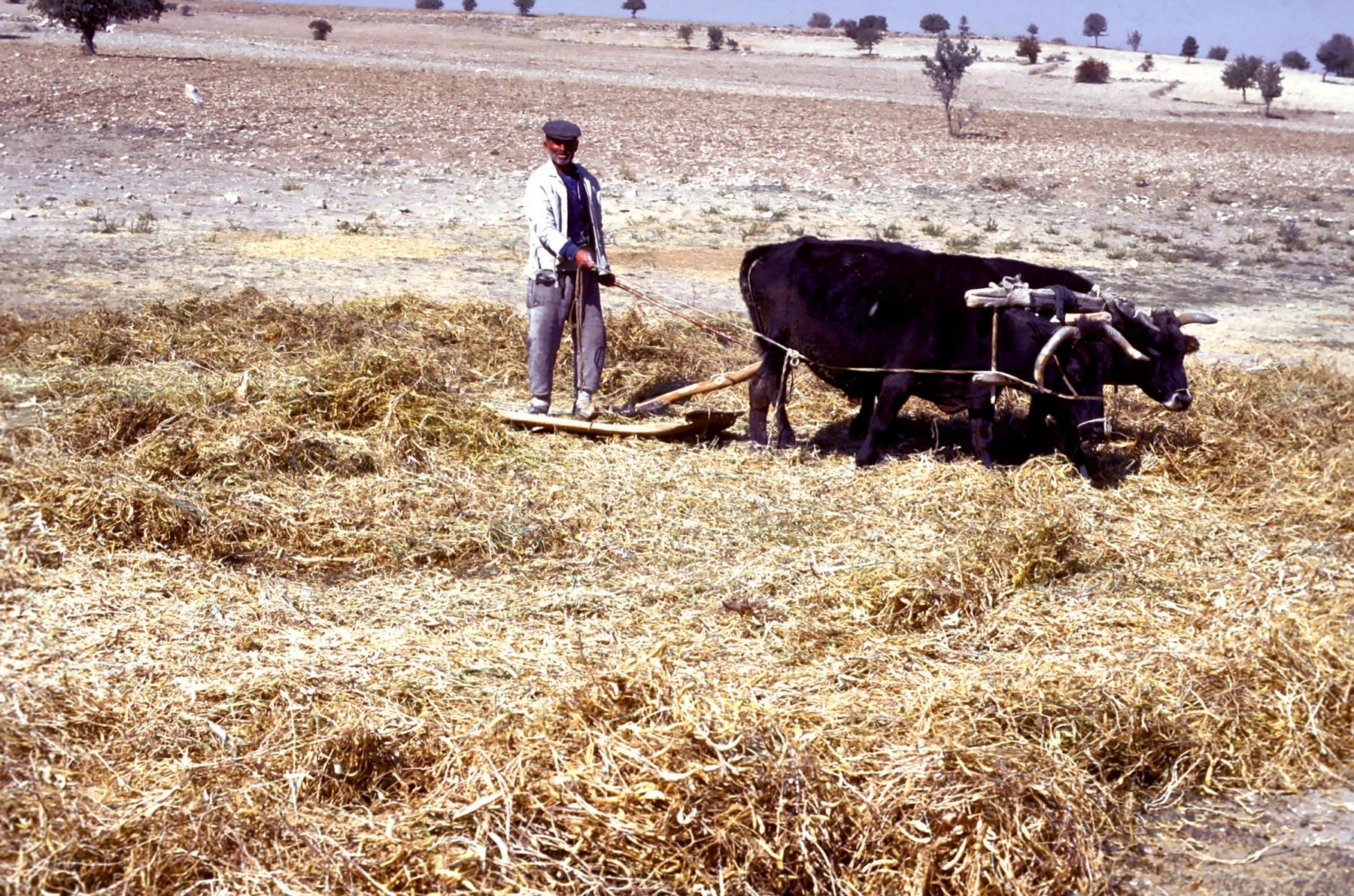 Riding the threshing sled Riding the threshing sled, or sledge, the farmer drives his oxen back and forth over the grain, grinding the husks and releasing the grain. This mixture will then be tossed into the air on a windy day, blowing the chaff away and leaving the grain, called winnowing. All of this work is done on a threshing floor. sled; sledge; threshing; farmer; farming; agriculture; grain; floor; chaff; winnowing; sleds; sledges; farmers; agricultures; grains; floors |