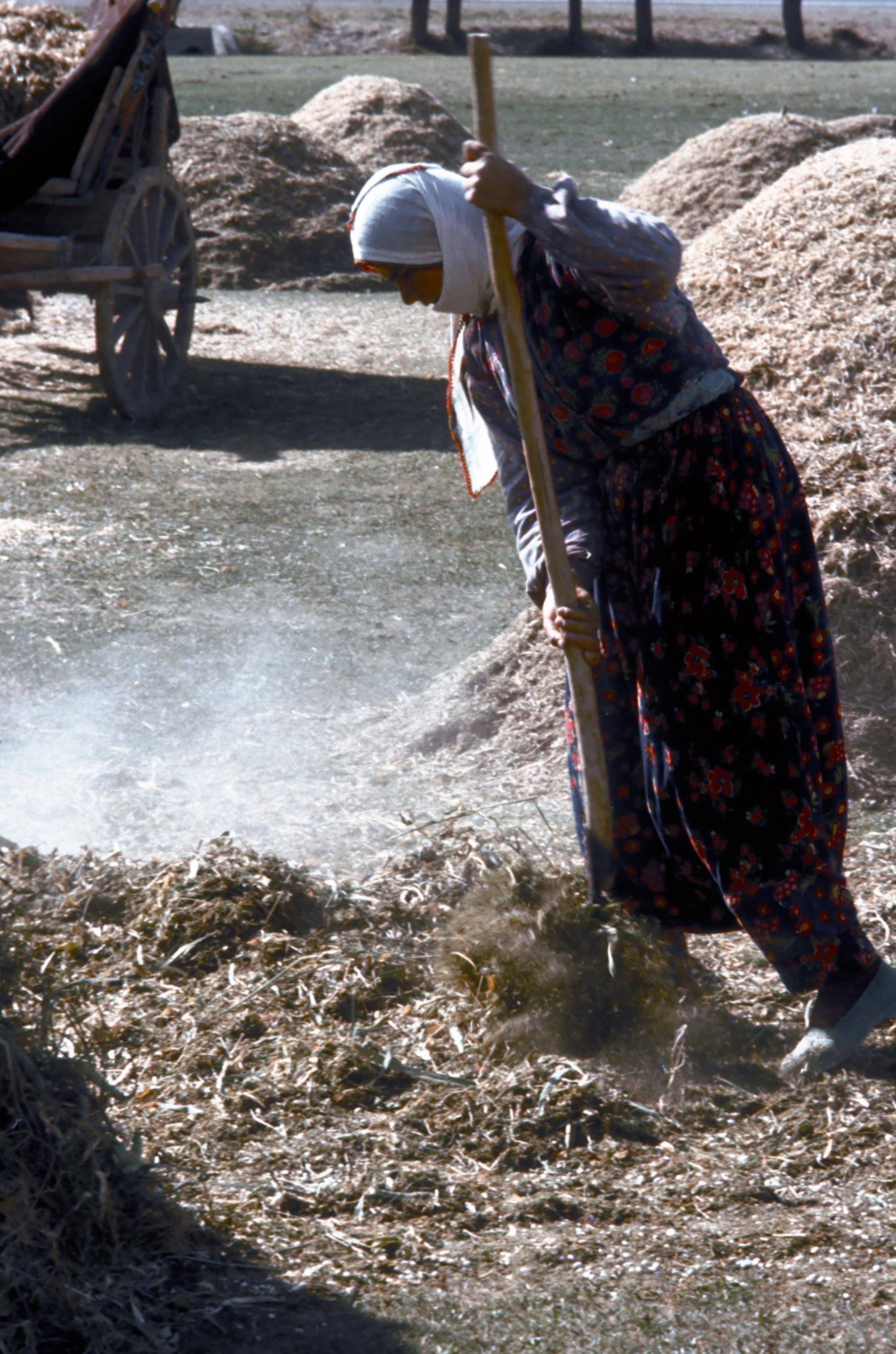 Winnowing This woman is preparing to lift a mixture of grain and chaff and toss it upward. The wind will blow the chaff away and the grain will fall into a pile. This will be repeated many times on the threshing floor to remove the chaff. This is called winnowing. winnowing; farming; agriculture; grain; harvesting; chaff; wind; threshing; floor; woman; fork; agricultures; grains; winds; floors; women; forks |