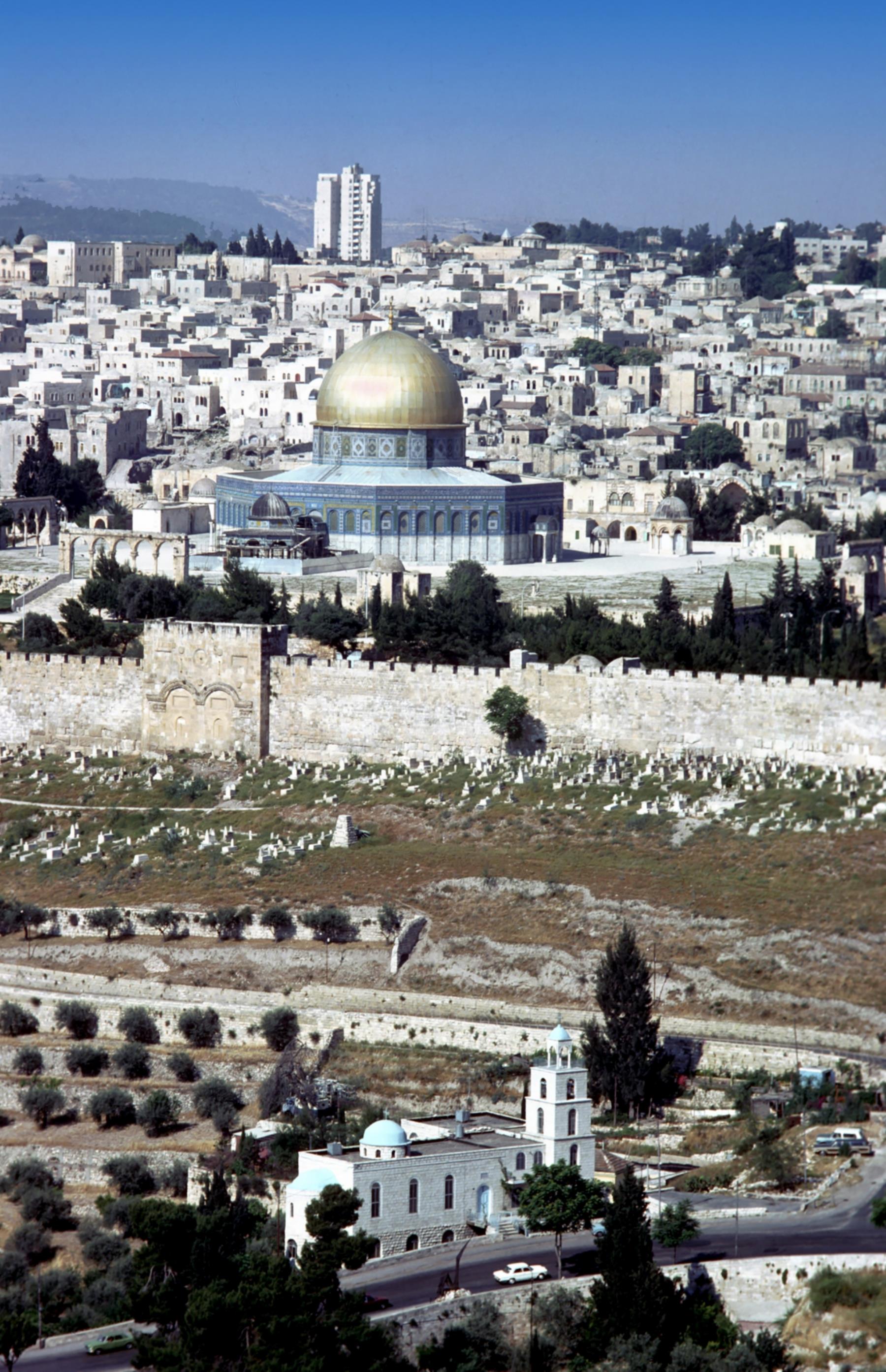 Old Jerusalem from the Mount of Olives Old Jerusalem from the Mount of Olives. The gold-domed building is the Dome of the Rock, a Moslim mosque. The Golden Gate is seen in the eastern wall of the city. jerusalem; old; mount; olive; gold-domed; dome; rock; golden; gate; eastern; wall; moslim; mosque; mounts; olives; domes; rocks; gates; walls; mosques |