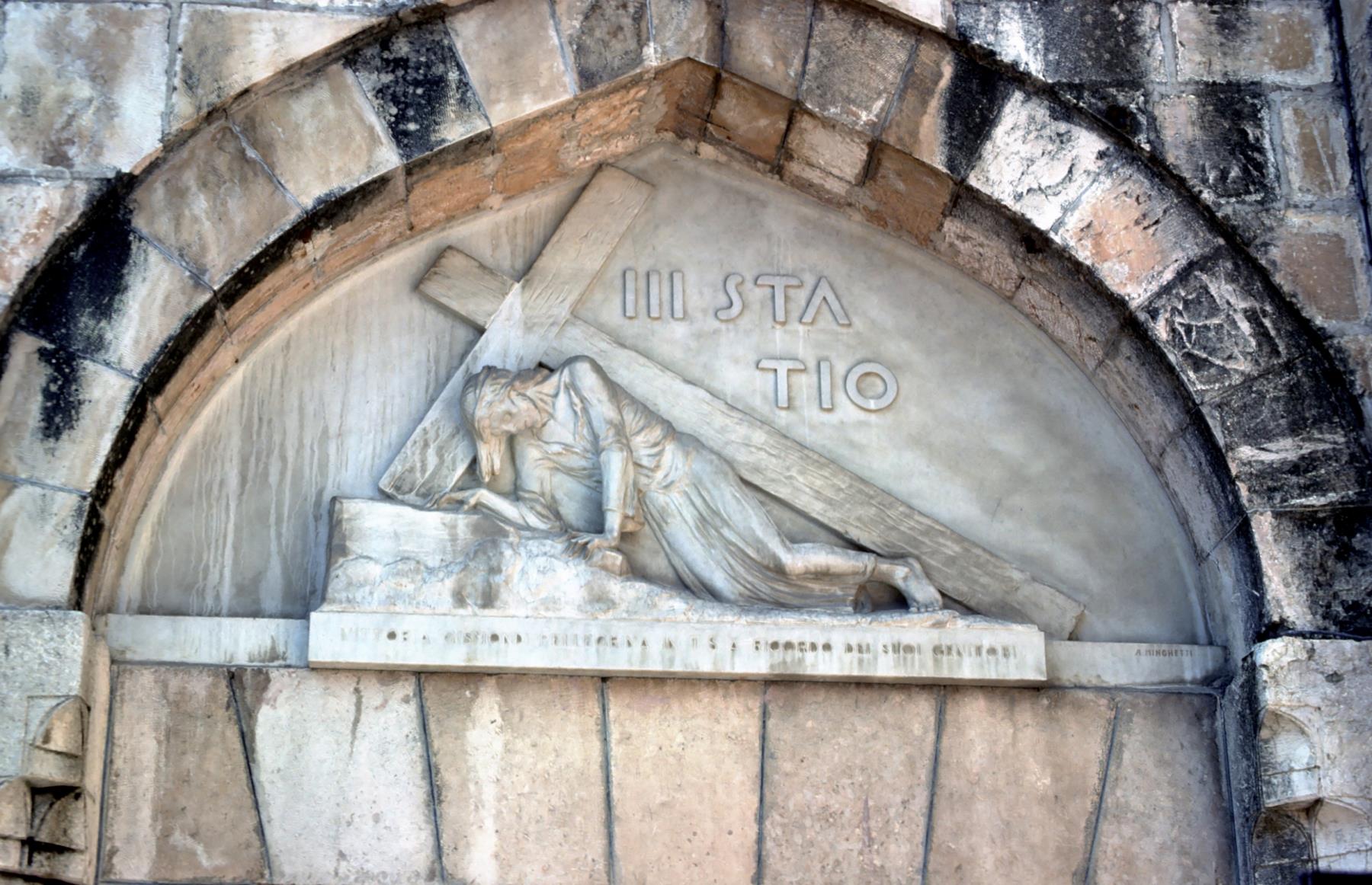Jerusalem On the Via Dolorosa in Jerusalem there are fourteen stations, or points relating to events of Jesus carrying his cross. This is station three, showing Jesus falling beneath his cross. jerusalem; via; dolorosa; fourteen; station; jesus; carrying; cross; three; falling; fourteens; stations; crosses; threes |