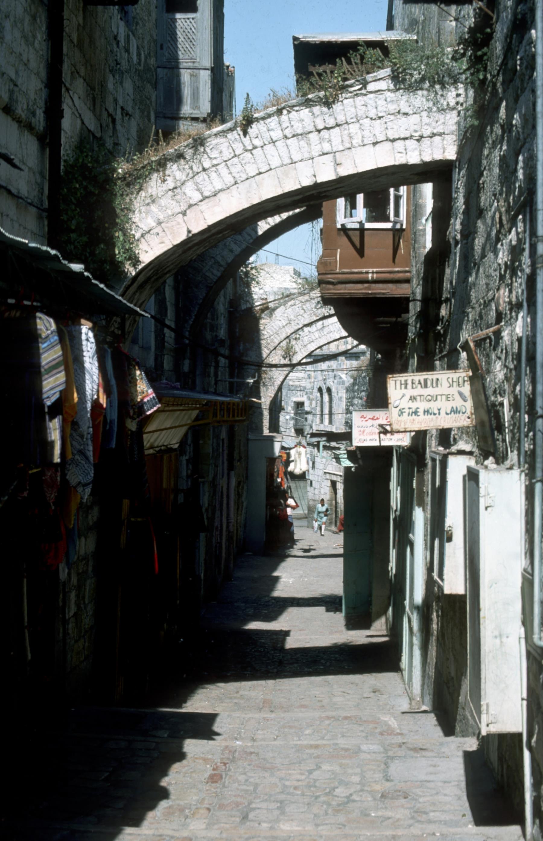 Jerusalem The Via Dolorosa of today is about one story above the one in Jesus' time. Through the centuries, the streets have gradually been filled with changing construction. jerusalem; via; dolorosa; today; century; filled; construction; to-day; to-days; centuries; constructions |