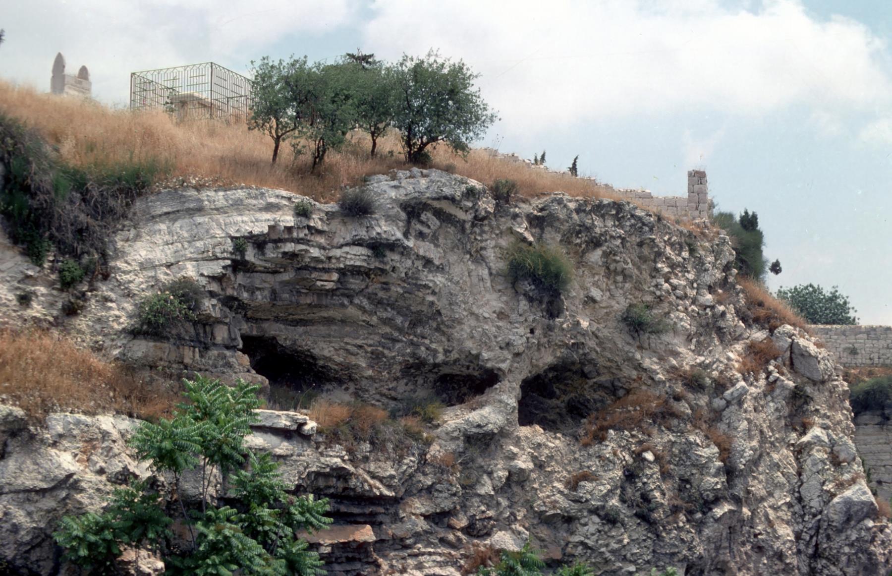 Jerusalem One traditional site of Golgotha is this hill with hollow eye sockets to look like the place of the skull. Another traditional site is in present-day Jerusalem, which in Jesus' time was just outside the wall. It is called the Church of the Holy Sepulcher. jerusalem; golgotha; calvary; crucifixion; jesus'; place; skull; wall; church; holy; sepulcher; crucifixions; places; skulls; walls; churches; sepulchers |