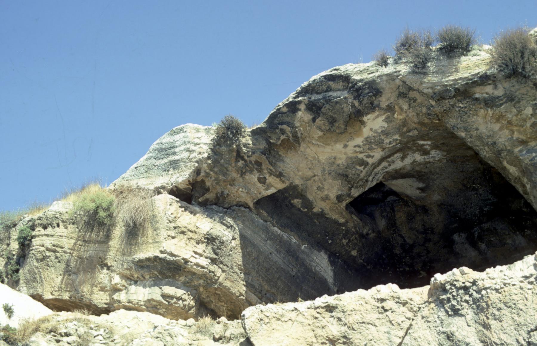 An eye socket of Jeremiah's Grotto An eye socket of Jeremiah's Grotto, one traditional site of Golgotha or Calvary. The entire hill resembles a skull. A Moslem cemetery is on top of this hill today. jerusalem; golgotha; calvary; jeremiah's; grotto; hill; skull; moslem; cemetery; grottos; grottoes; hills; skulls; moslems; cemeteries |