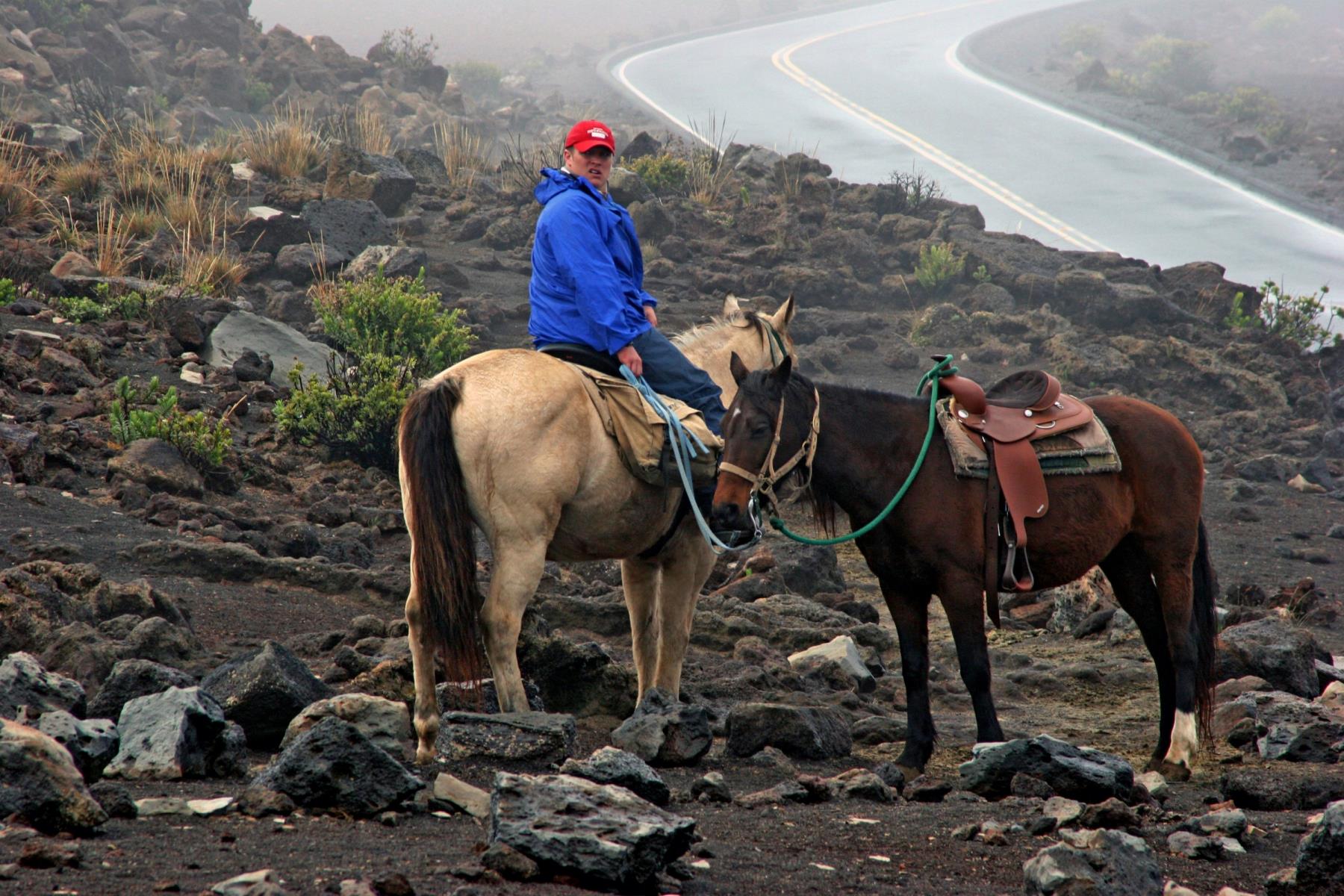 Horses and rider near Pu'u 'Ula'ula Summit Horses and rider near Pu'u 'Ula'ula Summit, overlooking the crater, or caldera, of the extinct volcano, Haleakala National Park, Maui, Hawaii. horse; rider; horseman; pu'u 'ula'ula summit; crater; caldera; extinct volcano; haleakala national park; maui; hawaii; horses; riders; horsemen; craters |
