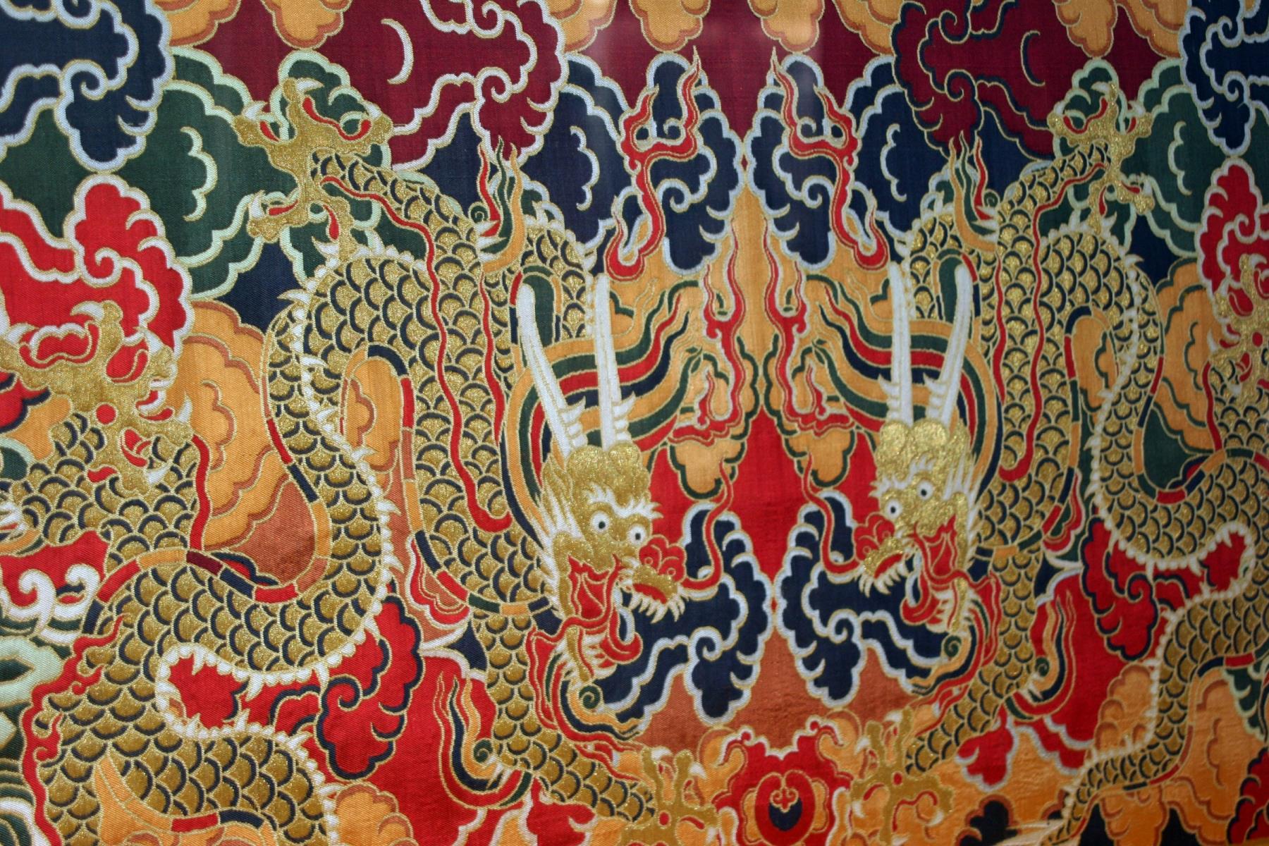 Textile Floral satin textile with gold threads and woven dragon pattern, Ming Tombs, imperial tombs of China. floral satin textile; gold threads; woven dragon pattern; ming tombs; imperial tombs; burial; cemetery; grave; death; dying; dead; dies; china; burials; cemeteries; graves; deaths |