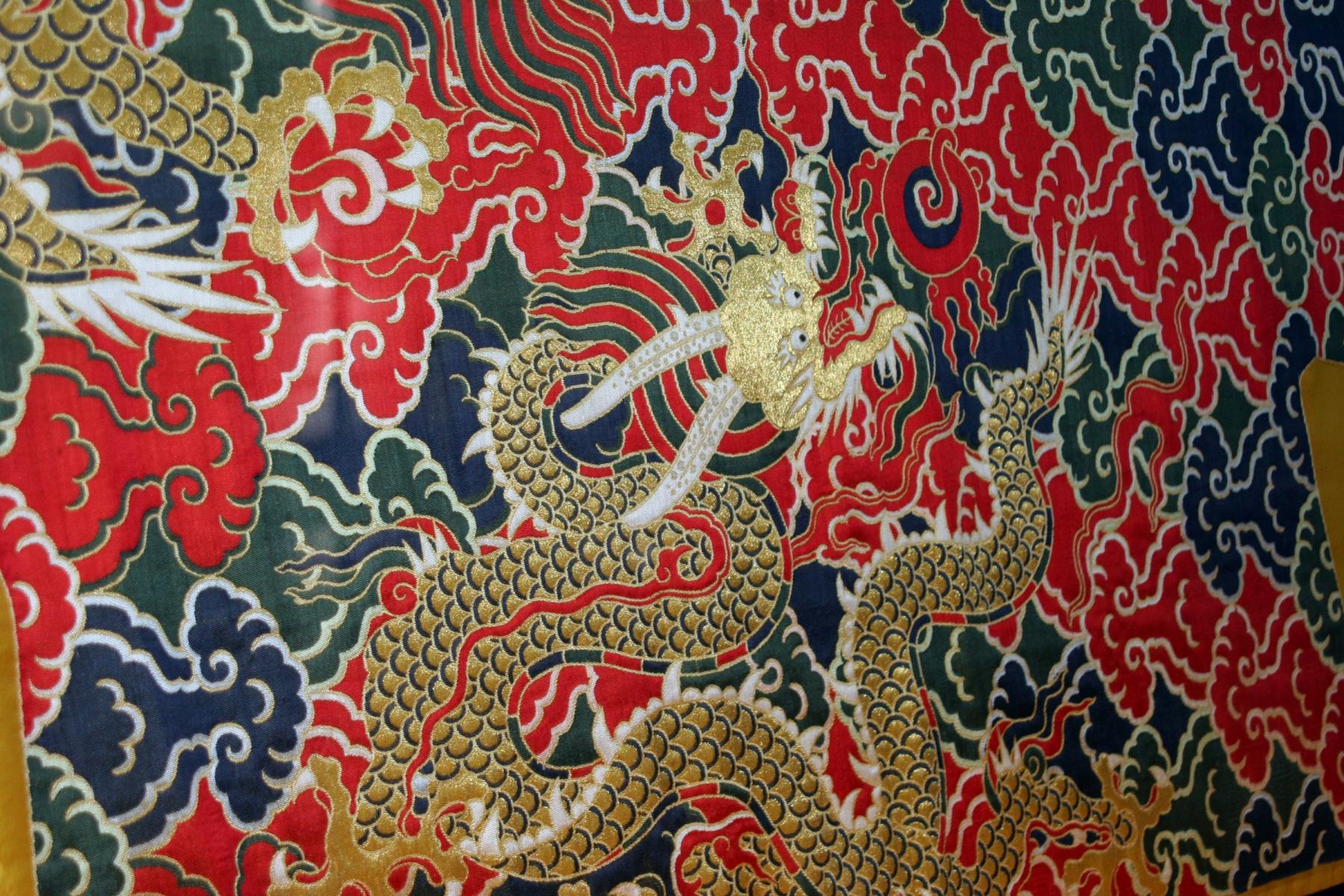 floral satin textile; gold threads; woven dragon pattern; ming tombs; imperial tombs; burial; cemetery; grave; death; dying; dead; dies; china; burials; cemeteries; graves; deaths