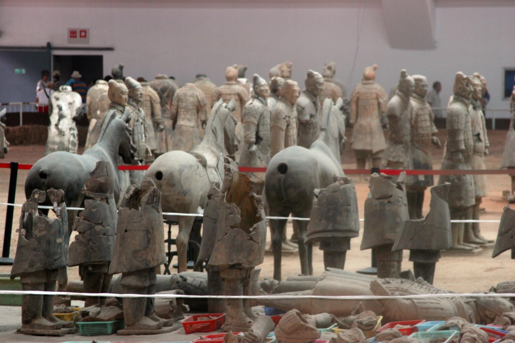 Terracota warriors and horses, Xian, China. These warriors guarded the tomb of Qin Shi Huangdi, a despotic ruler of China about 2, 200 years ago. There are 7, 000 figures, each originally covered with colorful paint. The ruler forced 70, 000 people to work 36 years to build these warriors and the tomb. Archaeological excavations began in 1974 when the site was discovered by a farmer digging a well.