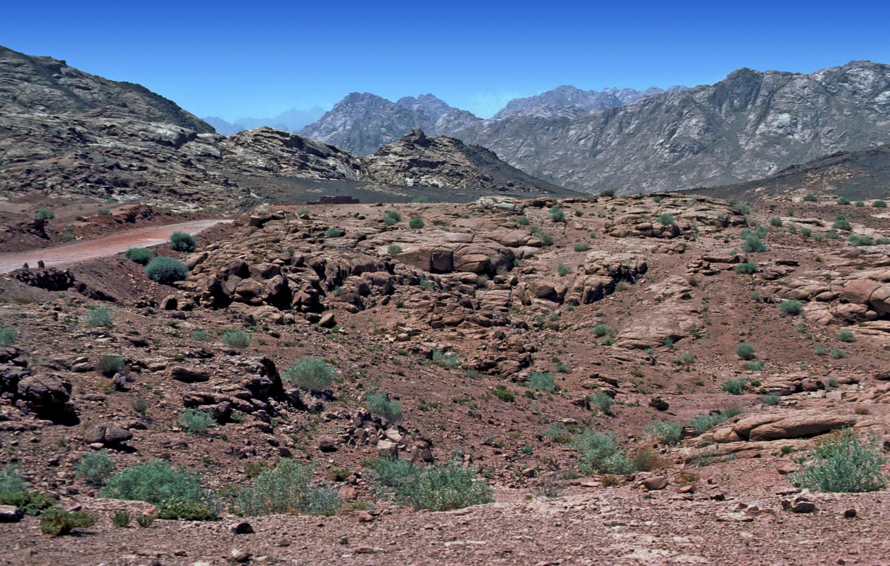 Sinai When the Israelites left Egypt and slavery, they reached Mount Sinai by the third month, camping at the foot of the mountain. Here God gave the Ten Commandments and the Law (Exodus 19--20). Later Elijah visited this mountain, also called Horeb, and heard God speak to him in a quiet voice (1 Kings 19:4-8). The exact location of Mount Sinai is uncertain, but since the 4th century A. D., a tradition has placed it near St. Catherine's Monastery, or Monastery of St. Catherines. This mountain of tradition is called Jebel Musa, or Mountain of Moses. Mountains near the oasis at Sinai are seen in the picture. sinai; mount; israelites; camp; law; elijah; horeb; monastery; jebel; musa; mountain; moses; commandment; ten commandments; saint catherine; saint catherine's monastery; mounts; camps; laws; monasteries; mountains; commandments |