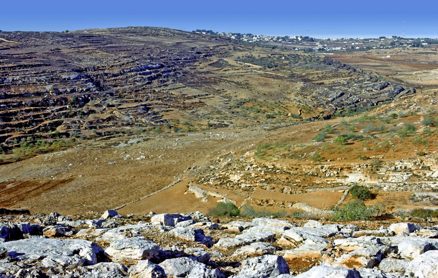 Bethel Twelve miles northwest of Jerusalem, on the border of Samaria and Judea, is a little Arab village named Beitin, sometimes called Beit El. Nearby is the site of ancient Bethel. Here Jacob stopped for the night enroute to Haran and dreamed of angels ascending and descending on a ladder, or stairway, to heaven. There is a British tradition that the stone which served as Jacob's pillow is now under the seat of the Coronation chair in Westminster Abbey. Bethel means house of God. In the distance, in this picture, is the modern Arab village Beitin, near Bible-time Bethel. Looking south from a point about a mile south of Bethel. bethel; israel; beitin; beit; el; jacob; ladder; stairway; angel; heaven; south; ladders; stairways; angels; heavens |