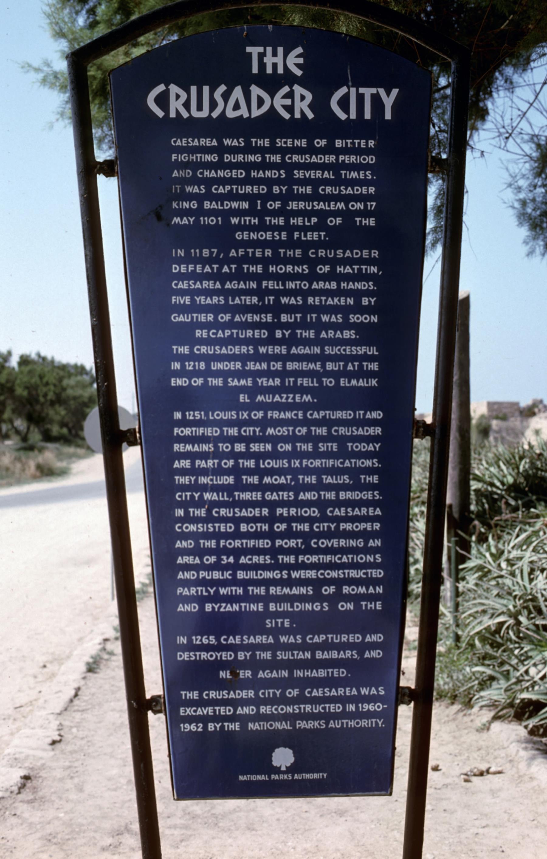 The first Herod The first Herod, called The Great, wanted to honor his patron, Augustus Caesar, with a fine harbor. Joppa was not fitting since it was dominated by strong Jewish, anti-Roman, feelings. So Herod spent twelve years building a magnificent harbor and naming it Caesarea. Here Paul was imprisoned for two years and brought to trial before governors Felix and Festus, King Agrippa, and Bernice. Ruins here are from both Roman times and later Crusader times, about 1100-1300 A. D. Sign of the Crusader city. caesarea; caesar; herod; great; seaport; harbor; paul; agrippa; bernice; felix; festus; archaeology; ruin; antiquity; remains; roman; crusader; city; sign; seaports; harbors; ruins; romans; crusaders; cities; signs |