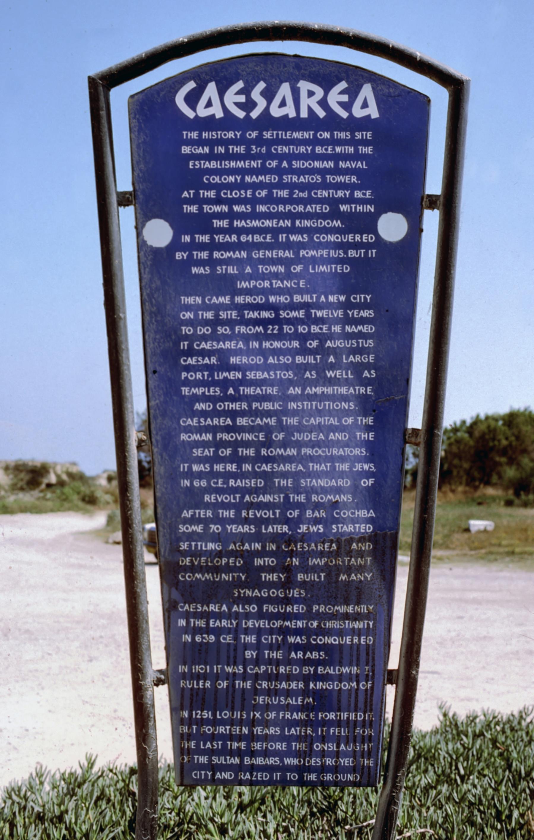 The first Herod The first Herod, called The Great, wanted to honor his patron, Augustus Caesar, with a fine harbor. Joppa was not fitting since it was dominated by strong Jewish, anti-Roman, feelings. So Herod spent twelve years building a magnificent harbor and naming it Caesarea. Here Paul was imprisoned for two years and brought to trial before governors Felix and Festus, King Agrippa, and Bernice. Ruins here are from both Roman times and later Crusader times, about 1100-1300 A. D. Sign at Caesarea. caesarea; caesar; herod; great; seaport; harbor; paul; agrippa; bernice; felix; festus; archaeology; ruin; antiquity; remains; roman; crusader; sign; seaports; harbors; ruins; romans; crusaders; signs |