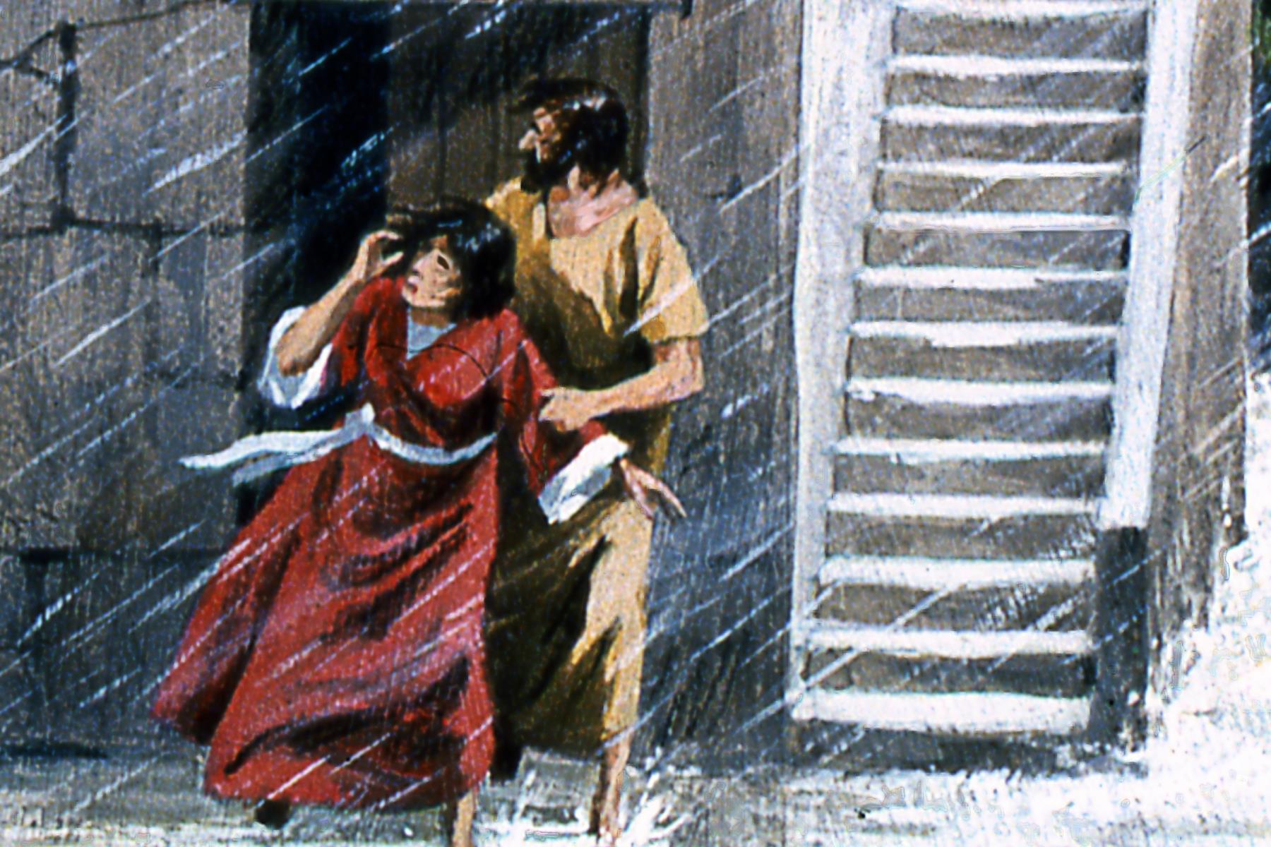 In stormy weather, people who had built their houses on poor foundations, such as sand, were fearful that their houses would fall down. Jesus said people who build their lives on faulty foundations will have life crumble in when troubles or disaster comes -- Matthew 7:24-27.