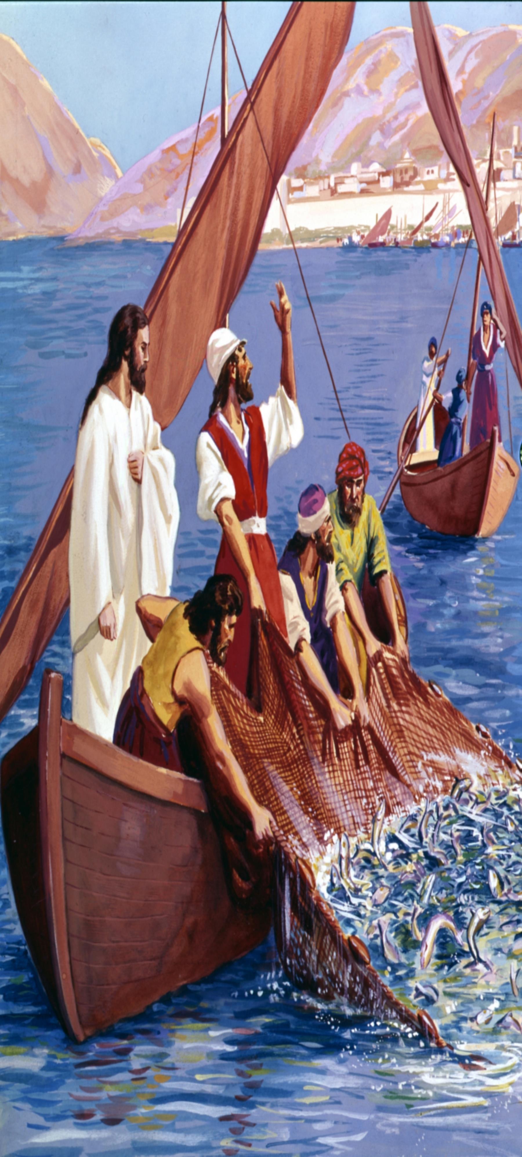 Jesus performs a miracle, helping the disciples catch many fish -- Matthew 4:13-16; Luke 5:1-11.
