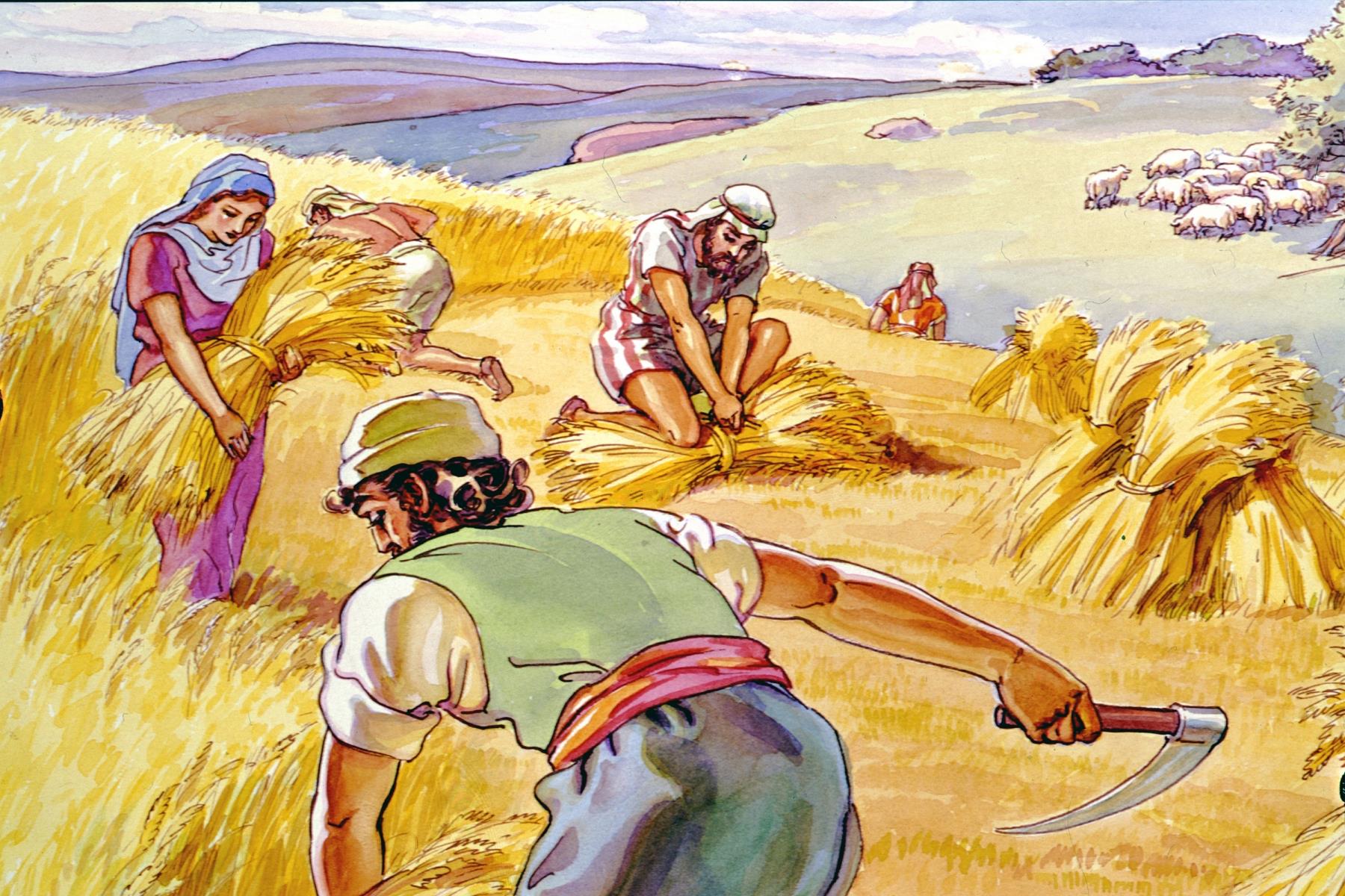 Grain, such as wheat and barley, was harvested with a sickle, then tied into bundles. These were taken to a threshing floor where oxen tread on the grain, or pulled sledges over the grain to separate the kernels from the stalks.