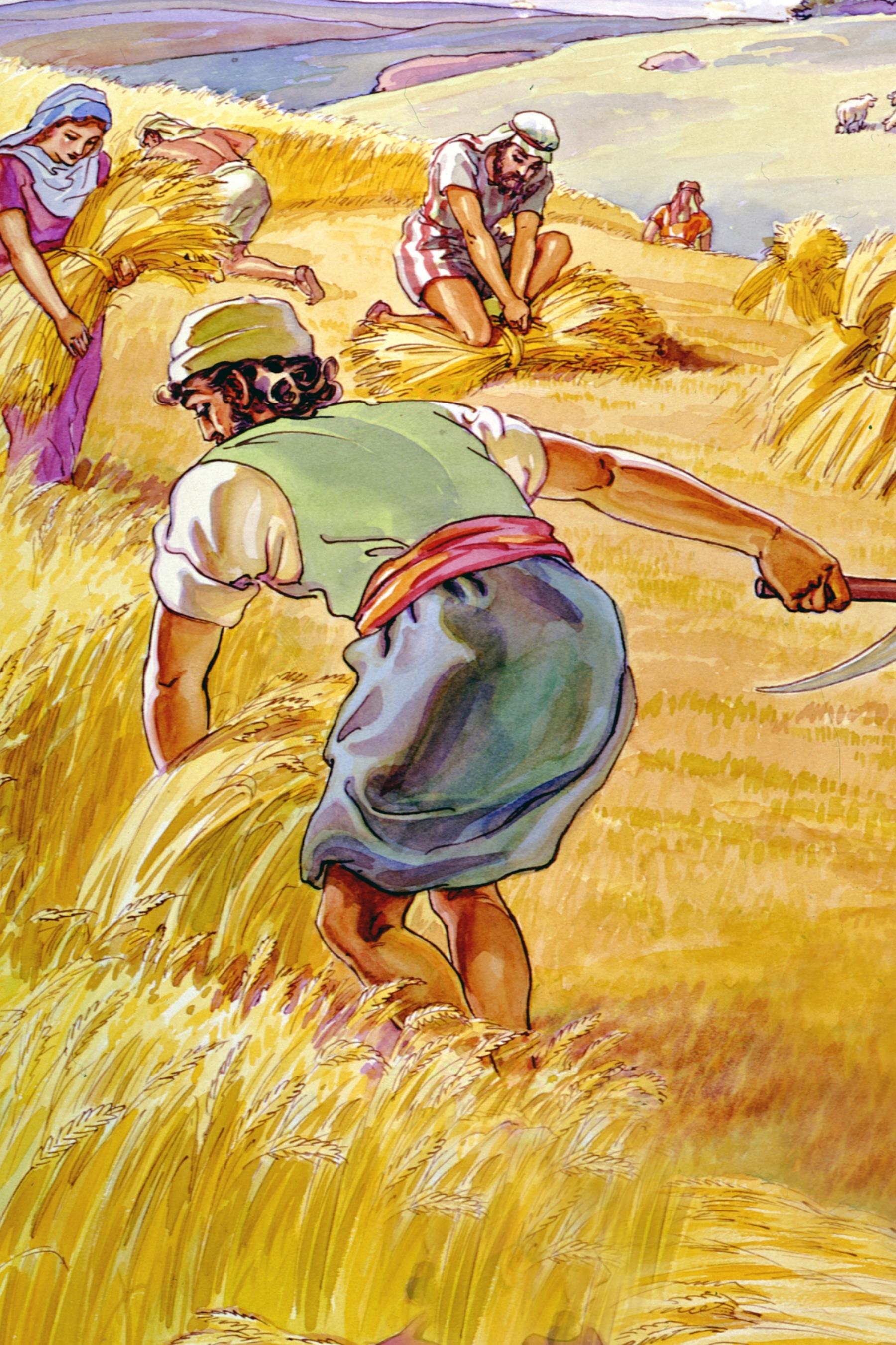 Grain Grain, such as wheat and barley, was harvested with a sickle, then tied into bundles. These were taken to a threshing floor where oxen tread on the grain, or pulled sledges over the grain to separate the kernels from the stalks. grain; wheat; barley; harvest; harvesting; harvested; agriculture; farm; farming; farmed; farmer; sickle; bundle; grains; harvests; agricultures; farms; farmers; sickles; bundles |