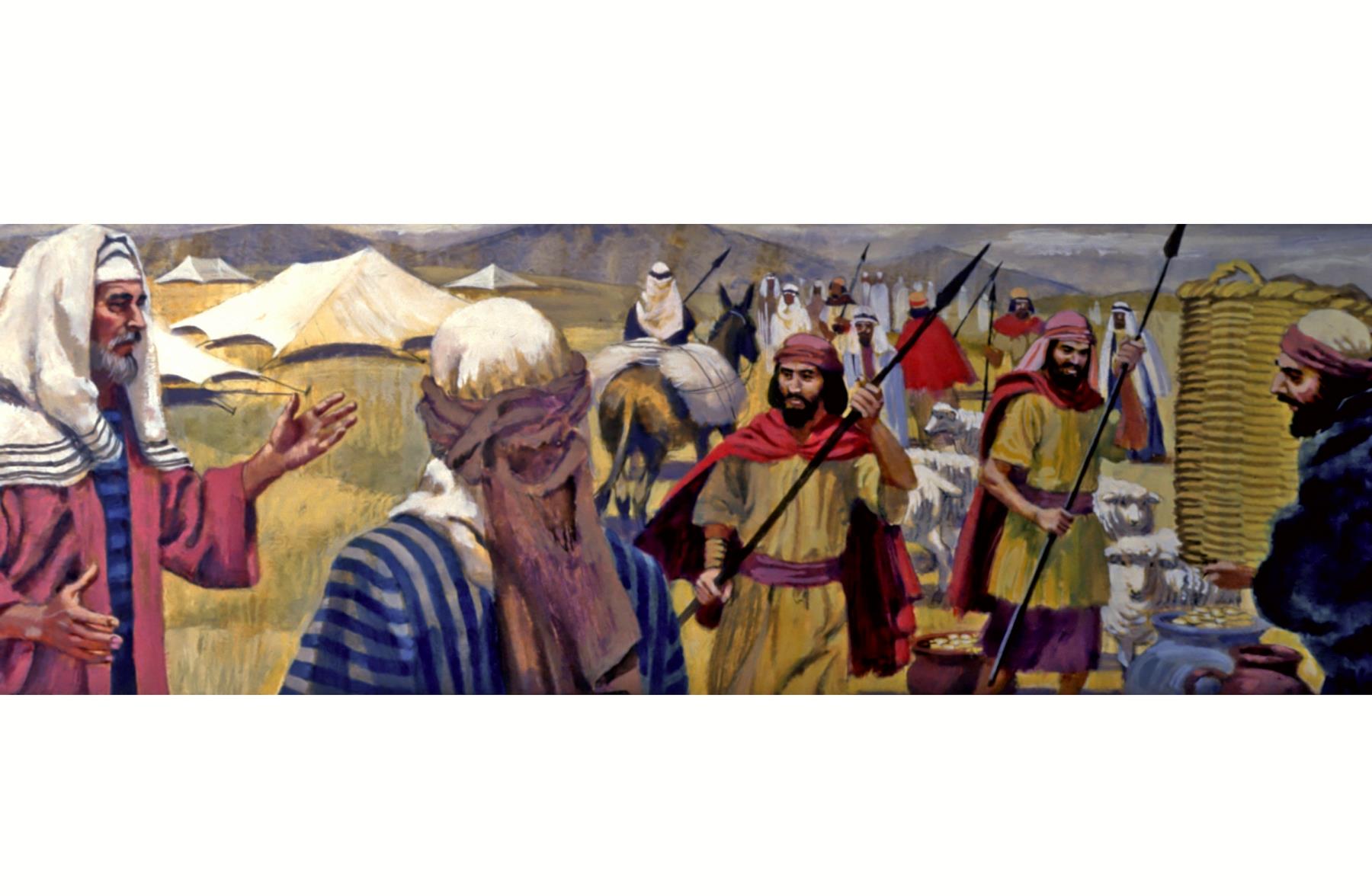 War came to the land in the days of Abram and Lot when five subject kings rebelled against Chedorlaomer, or Kedorlaomer and Lot was captured (Genesis 13:5--14:24). Abraham rallied his men, attacked at night, conquered the enemy, and rescued Lot. In this painting, he is sharing the spoils of battle with Melchizedek, king of Salem.