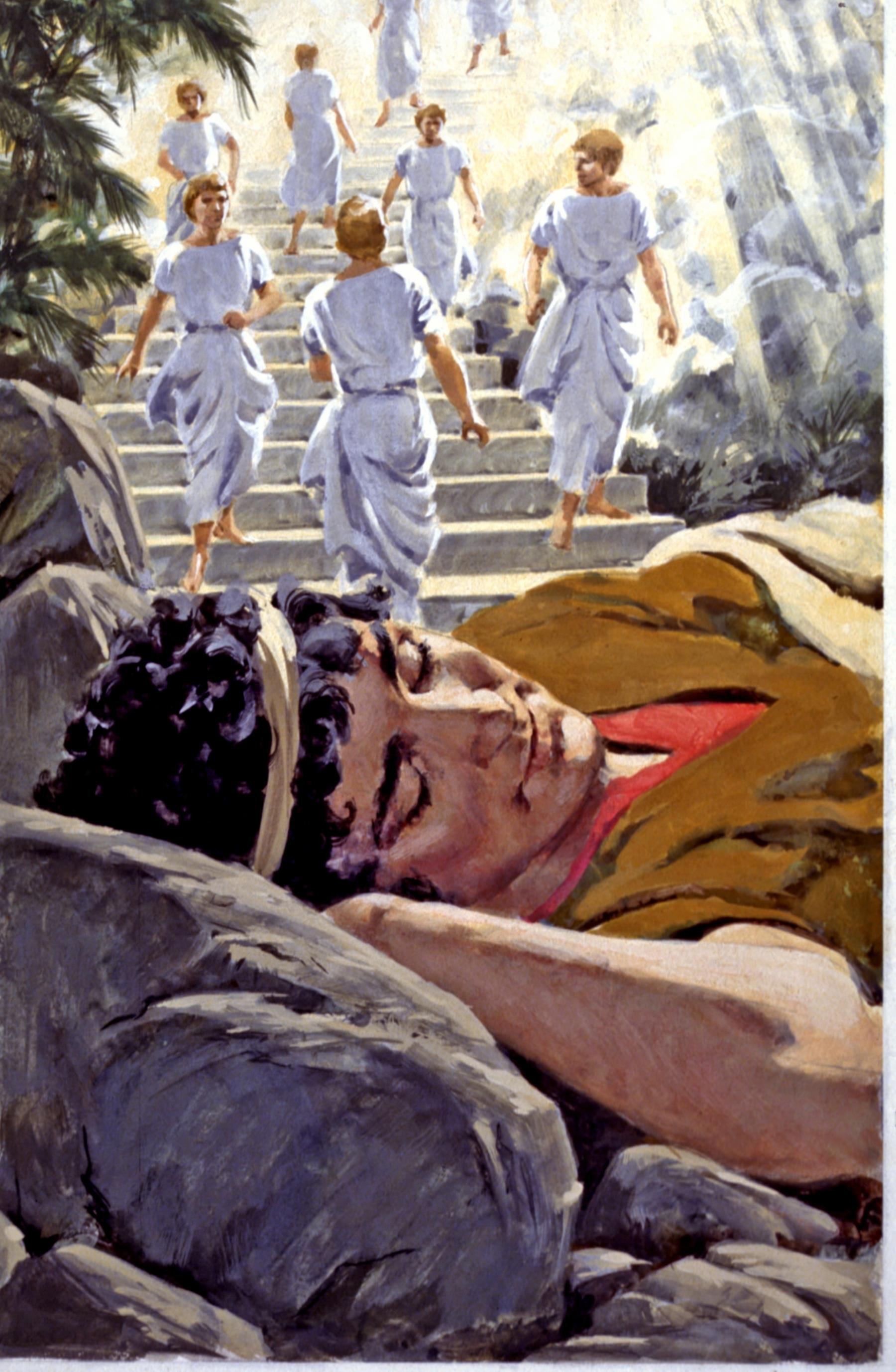 Jacob Running away from home and the anger of his brother Esau, Jacob camped for the night at Bethel. There he saw a vision of a ladder or stairway to heaven, with angels ascending and descending on it (Genesis 28). jacob; esau; bethel; genesis 28; camped; camp; camping; camper; night; dark; evening; vision; dream; ladder; stairway; heaven; angel; ascending; descending; camps; nights; evenings; visions; dreams; ladders; stairways; heavens; angels |