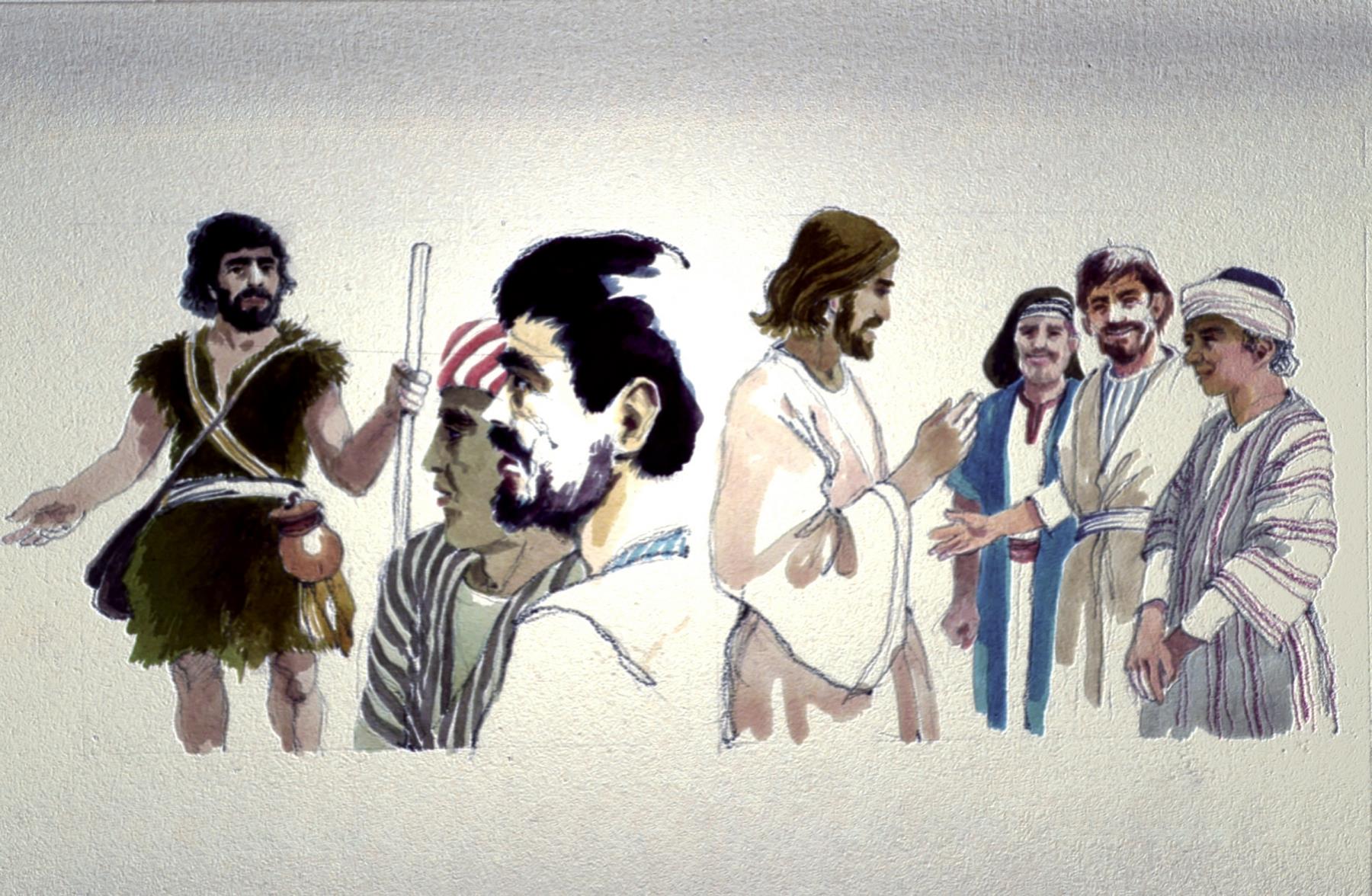 At the left At the left, Andrew, Peter's brother, was a disciple of John the Baptist before he met Jesus. Then he became a disciple of Jesus. At the right, Peter, along with James and John formed the inner circle of Jesus' disciples. peter; andrew; brother; john the baptist; disciple; inner circle; jesus' disciples; disciple; brothers; disciples |